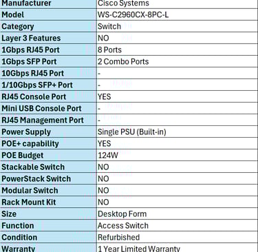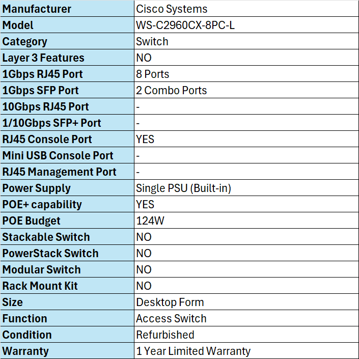Explore the detailed specifications of #WS-C2960CX-8PC-L in the comprehensive data sheet provided below.